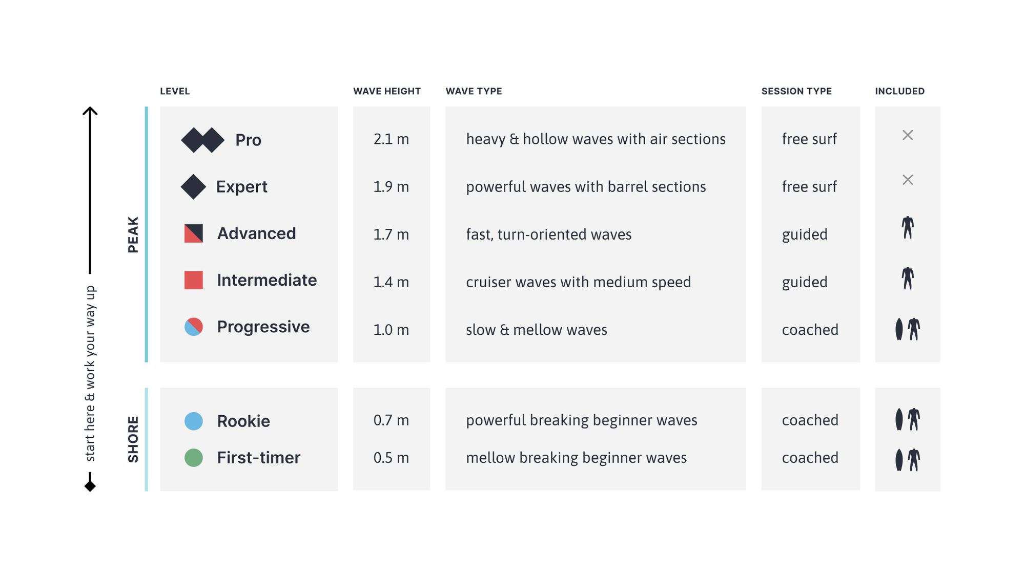 Our waves vary in height, power and speed. Find out which session suits you best.